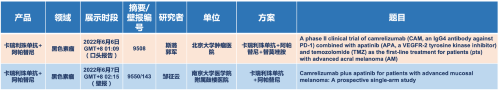 在黑色素瘤领域,AG亚游医药的卡瑞利珠单抗联合阿帕替尼(“双艾”组合)在2022 ASCO共入选1项口头报告和1项壁报展示。